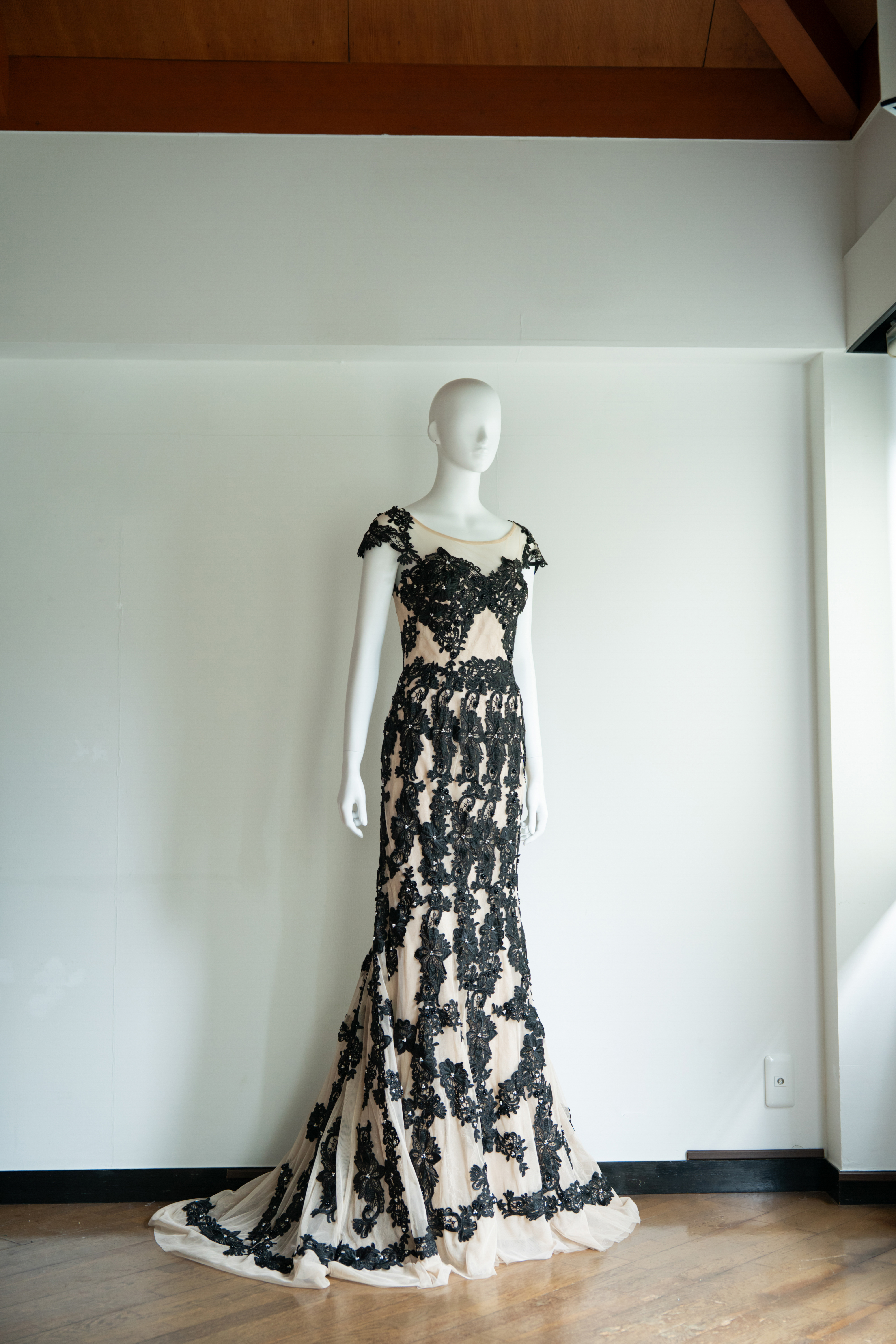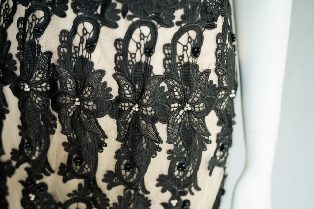 チュールレースを3枚重ねて、さらにブラックのモチーフをあしらった凝ったデザインの1着。シャンパンカラーとブラックのバランスが絶妙です。