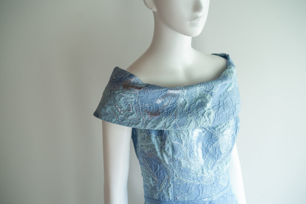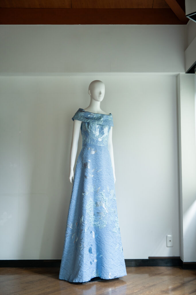 澄んだライトブルーに、シルバーやメタリック糸を織りこんだ上質なジャガード生地で仕立てられた1着。